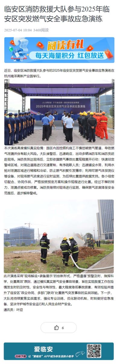 近日,临安区消防救援大队参与的2025年临安区突发燃气安全事故应急演练在杭州南洋高新产业园举行。