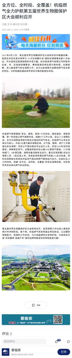 2025年9月22日,第五届世界生物圈保护区大会将在杭州隆重启幕,临安区天目未来谷将举行“人与生物圈计划”国际协调理事会第37次会议。作为临安区能源保障的中坚力量,杭州临安燃气有限公司积极响应省、市、区各级部署要求,秉持高度的责任感与使命感,全面统筹、深入推进燃气安全保障工作,全力以赴保障大会期间燃气安全稳定供应,为护航国际盛会筑牢坚实可靠的能源生命线。