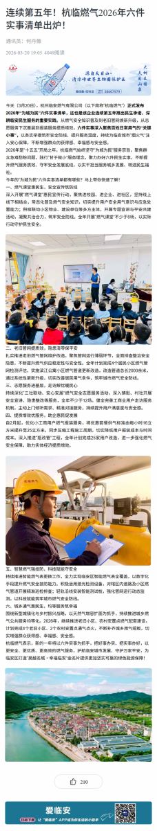 2026年是“十五五”开局之年,杭临燃气始终坚守“为城为民”服务宗旨,聚焦群众急难愁盼问题,践行“甘于微小”服务理念,聚力办好六件民生实事,不断提升燃气服务质效、守牢安全发展底线,以实干担当服务城乡发展、增进民生福祉。
